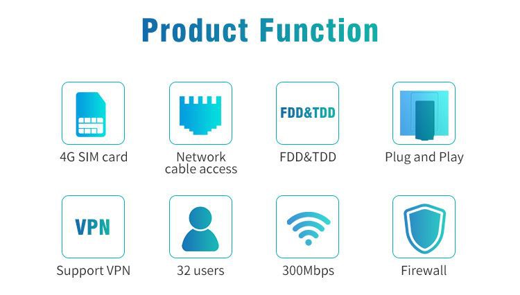 Det er en CAT 4 4G WiFi-ruteroverføringshastighet på opptil 300 Mbps, 4G-hastighet opptil 150 Mbps, TDD-LTE: 150 Mbps DL / 50 Mbps UL TD-SCDMA: 2,8 Mbps DL / 2,2 Mbps UL. Terminalen kan støtte tre kommunikasjonsmoduser: TDD FDD, WCDMA. Den støtter Internet Access / PPPoE arbeidsmodus, bruker 4G SIM-kort, kan koble til modem fungerer som Gateway-modus, utstyrt med 4 LAN-grensesnitt, kan koble til andre enheter samtidig. Det er enkelt å koble til og enkelt å bære i hånden Dele kunde til 32 WiFi-brukere, bare sett inn SIM-kortet, så kan nyte WiFi med denne bærbare 4G LTE-ruteren.